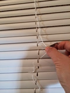 2. Then find the ladder cord holding all your blinds in one spot. You are going to cut this cord. My blinds had 3 of them. Don't cut the thicker cord. That one is what pulls your blinds up and down. (please note my spray painted fingers)